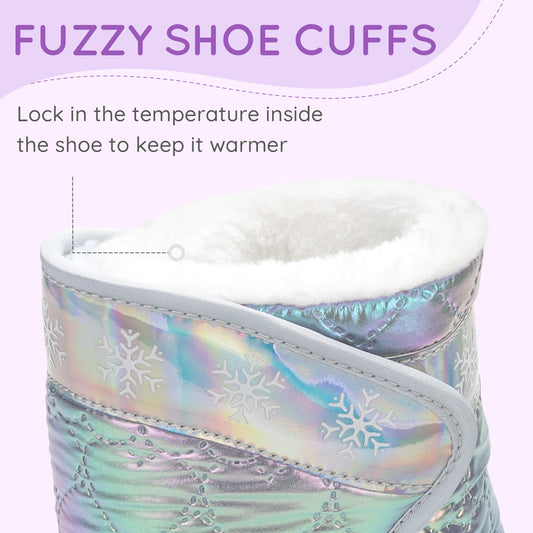 - Fashionable design: These girls' snow boots feature purple unicorn graphics, rainbow design elements, and a soft microfleece lining, allowing your little ones to have fun in the cold weather and enjoy winter activities.