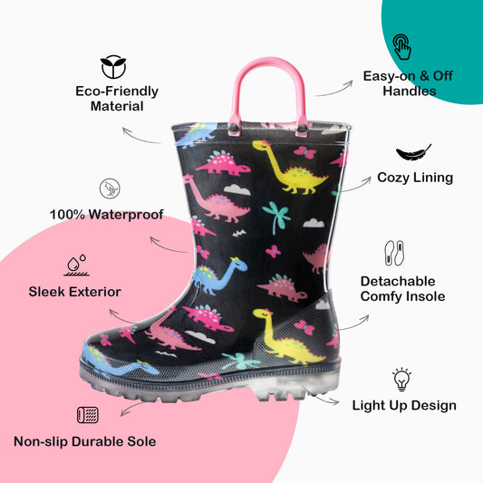 - ✅ Light Up Flashing Design Rain Boots – Easy to clean and cool both in the dark and outside.