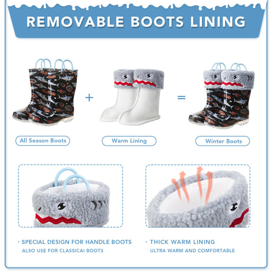 - √ Easy on Handles Design, toddlers can easily wear on and off the Kids Removable Warm Rain Boots on their own without any hassle.