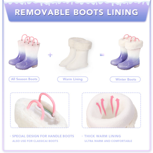- √ Easy on Handles Design, toddlers can easily wear on and off the Light Up Kids Removable Warm Rain Boots on their own without any hassle.